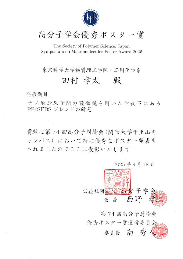 先日開催された第74回高分子討論会で田村君が優秀ポスター賞を受賞しました。おめでとう!