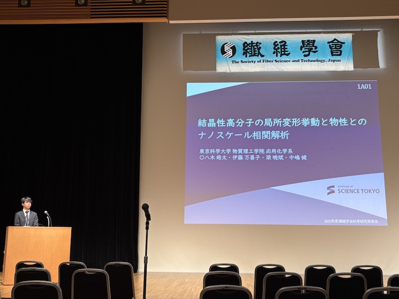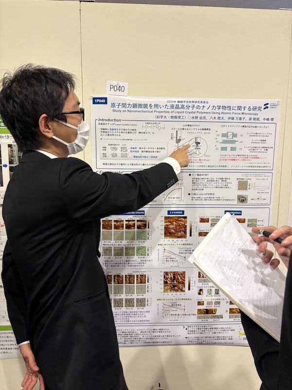 ニュース 2025年繊維学会秋季研究発表会@山形 山形市の山形テルサで開催されている2025年繊維学会秋季研究発表会に参加しています。 M2八木(口頭)「結晶性高分子の局所変形挙動と物性とのナノスケール相関解析」 D2水野(ポスター)「原子間力顕微鏡を用いた液晶高分子のナノ力学物性に関する研究」 懇親会後に二次会も開催。B4橋口も聴講しに来てました。 « Prev Next » ニュース一覧 2025.10.28