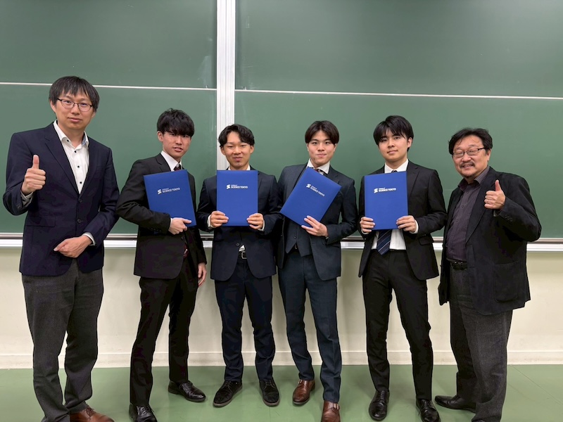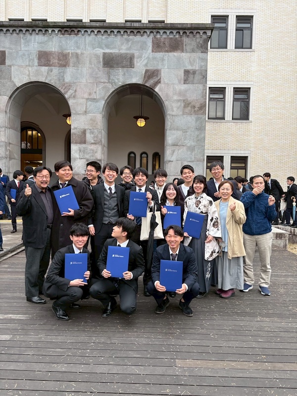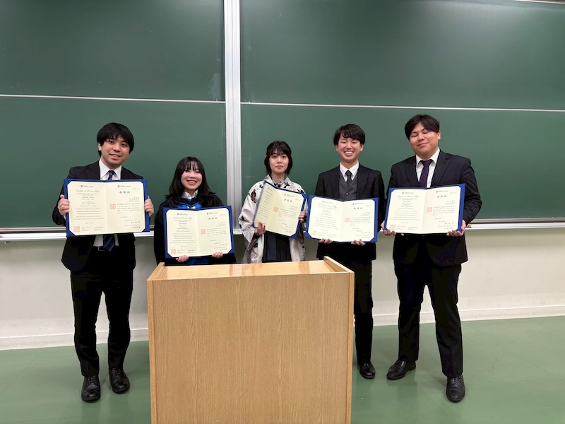 イベント 令和7年度学位授与式 B4の大空、雄哉、てっちん、颯汰、卒業おめでとう!4月からもよろしく! M2の天紀、翔大、花音、春香、そして皓太、卒業おめでとう。翔大、春香、皓太はそれぞれの道で新しい人生を切り拓いてください。天紀と花音は引き続きよろしくね。 « Prev Next » イベント一覧 2026.03.26